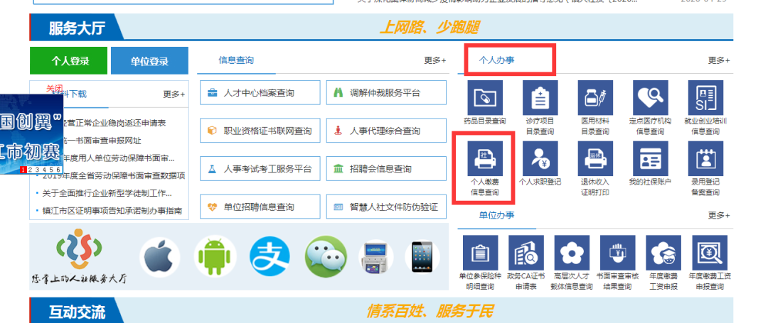 2、点击“个人办事”—”个人缴费信息查询“。如下图所示