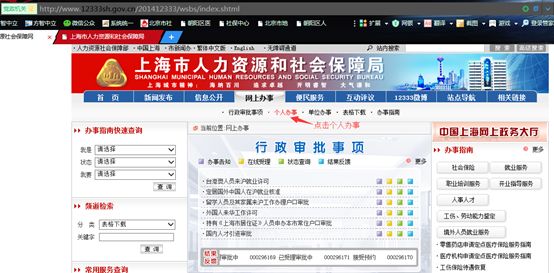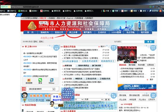 2、点击打开上海市人力资源与社会保障局网http://www.12333sh.gov.cn/,点击“网上办事”。